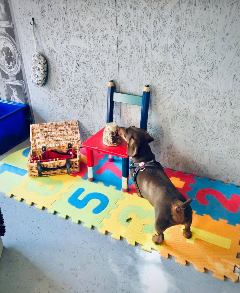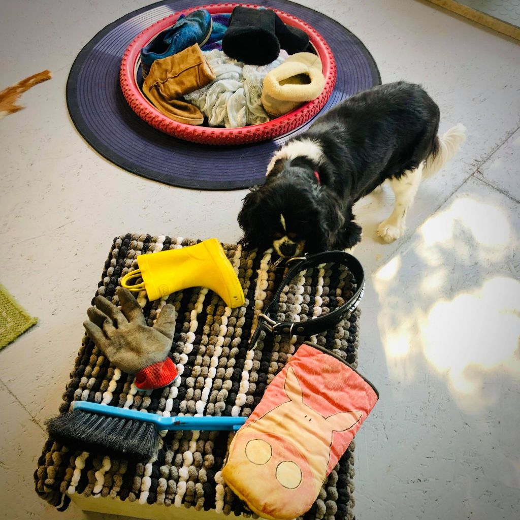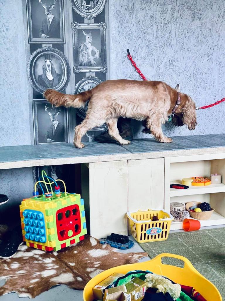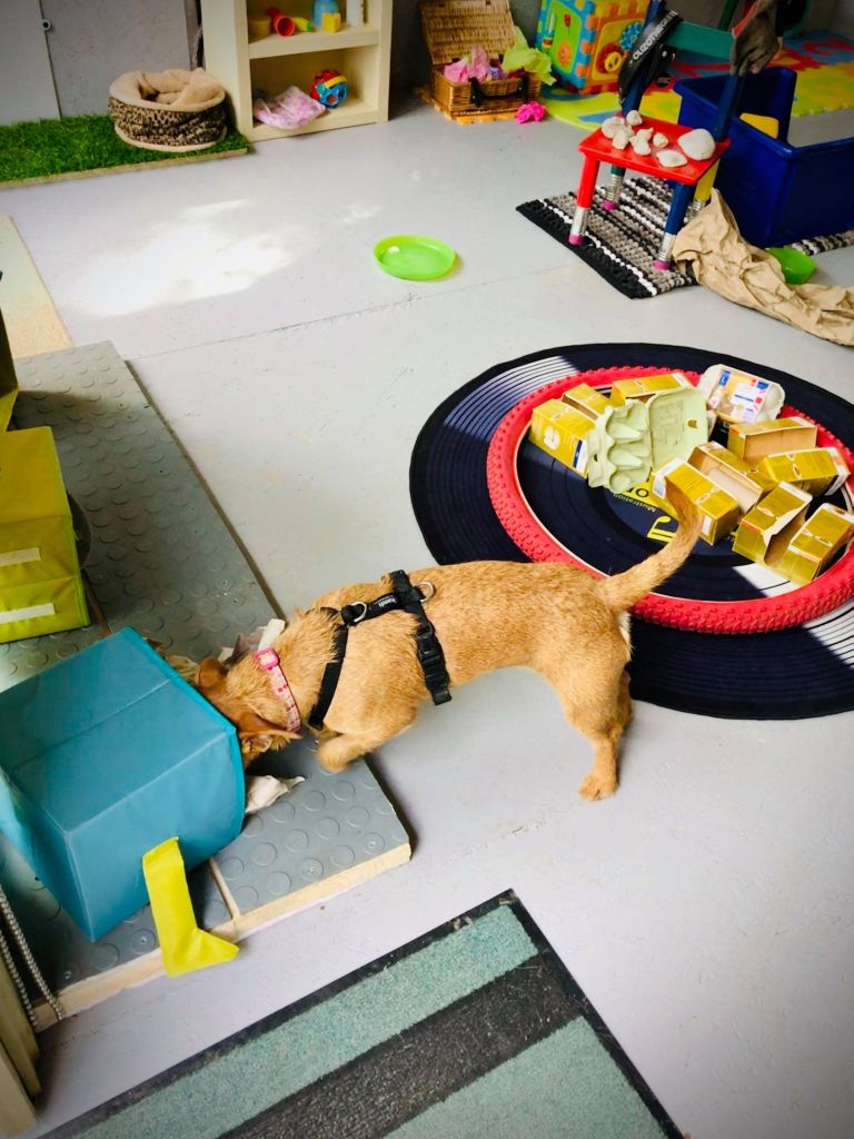 Objects are chosen to enhance the visual experience using colours in blue and yellow, (a dog’s sight spectrum), the sense of touch with varying textures underfoot including foam, natural fur, synthetic and natural fibre non-slip mats, natural sounds of bird song and the wind moving through tall grasses, plus bells and rattles for the non-sound sensitive. Different morsels of food can be discovered ranging in tastes and textures from soft pate to crunchy vegetables or dried fish skin. Scents and smells are intriguing to all dogs, it’s the main way they evaluate the world around them and the simple act of sniffing is another natural de-stressor resulting in a calming effect. With an array of old objects to investigate such as toys, boots, bicycle tyres, all of which contain a great scent history, plus animal scents to discover on old horse rugs, feathers, and brushes, provide a great olfactory workout for your dog.